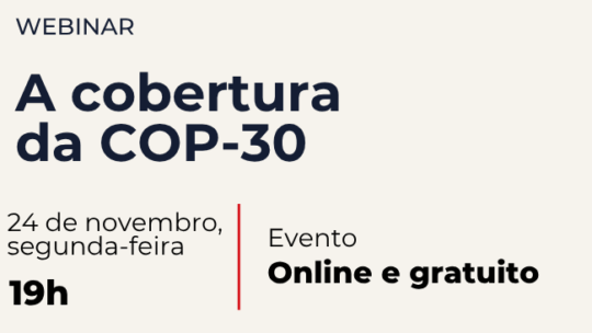 A cobertura da COP30 é o tema do próximo webinário do Observatório da Imprensa, no dia 24, próxima segunda-feira, às 19h. O debate pode ser acompanhado ao vivo pelo YouTube do Projor, neste link. Participam da conversa Katia Brasil, editora-executiva da Agência Amazônia Real e diretora editorial do Projor; Lucas Altino, repórter do jornal O […]