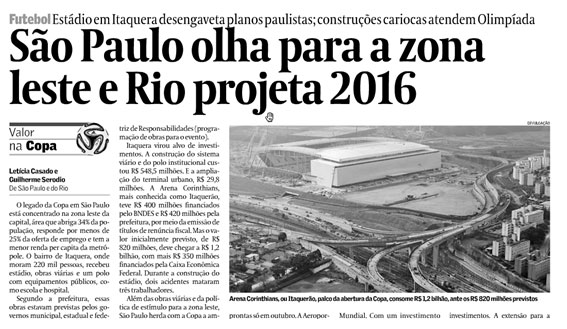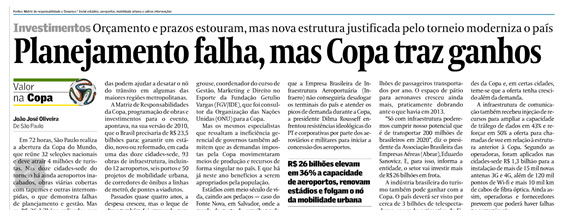 O Valor publicou igualmente, em 9 de junho, um conjunto de reportagens na contramão do ceticismo generalizado diante das obras feitas sob o guarda-chuva da Copa. Começa com a constatação do planejamento deficiente (marca registrada do país, é bom que se diga), mas lista ganhos resultantes da aplicação de R$ 26 bilhões em mais de 80 projetos.