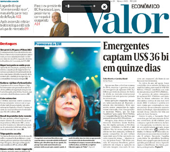 Se o leitor reparar bem, na primeira imagem da capa do Valor, acima da dobra, há uma chamada para entrevista do ex-presidente do BC Chico Lopes (governo FHC). Excelente. Não é a primeira dada a esse jornal, nem é a primeira vez que ele avalia ser exagerado o pessimismo com o país.