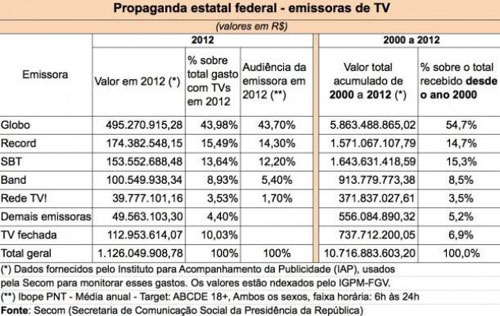 O governo federal é o maior anunciante do Brasil. Em 2012, os recursos destinados à publicidade de ministérios, órgãos e empresas estatais somaram R$ 1.797.848.405,13.