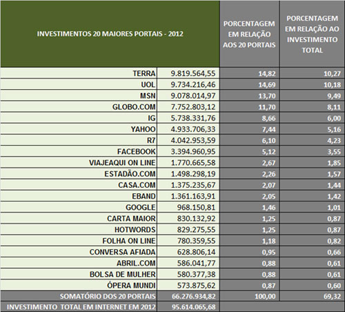 A Secom acabou nos fornecendo os 20 maiores investimentos programados em 2012, que mistura portais e sites, embora o título da sua tabela refira-se só a portais. A parte em verde é da tabela original. A cinza, acrescida, é nossa.