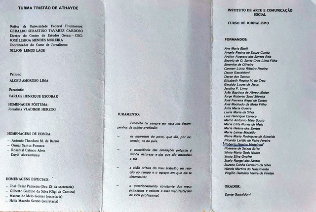 O dia 19 de dezembro de 1975 seria especial para os 32 formandos em Jornalismo do Instituto de Arte e Comunicação Social da Universidade Federal Fluminense (IACS/UFF). Eles compunham a Turma Tristão de Athayde, pseudônimo do crítico literário e pensador católico Alceu Amoroso Lima, escolhido patrono e convidado para a solenidade a se realizar na Associação Fluminense de Jornalistas, no centro de Niterói.