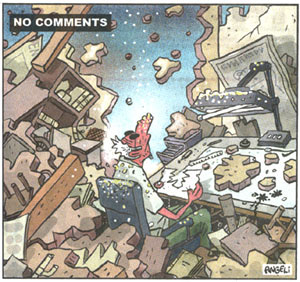O chargista Angeli, na Folha do dia 13/9, desenhou a si mesmo simplesmente atônito em sua prancheta, o estúdio em ruínas como as torres gêmeas, e o título "No comments".