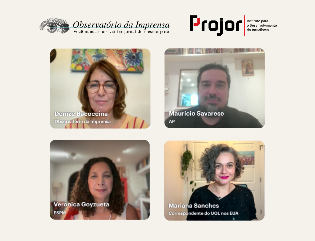 Participaram do debate Veronica Goyzueta, professora de Jornalismo da ESPM e correspondente do jornal espanhol ABC, Mariana Sanches, colunista do UOL em Washington, e anteriormente correspondente nos EUA para a BBC News Brasil e repórter em O Globo, Época e Marie Claire, Mauricio Savarese, repórter da agência de notícias AP e comentarista do Jornal da Cultura, em São Paulo, e Paula Ramon, jornalista venezuelana, correspondente da AFP em Los Angeles, anteriormente repórter e editora da agência no Brasil e no Uruguai.